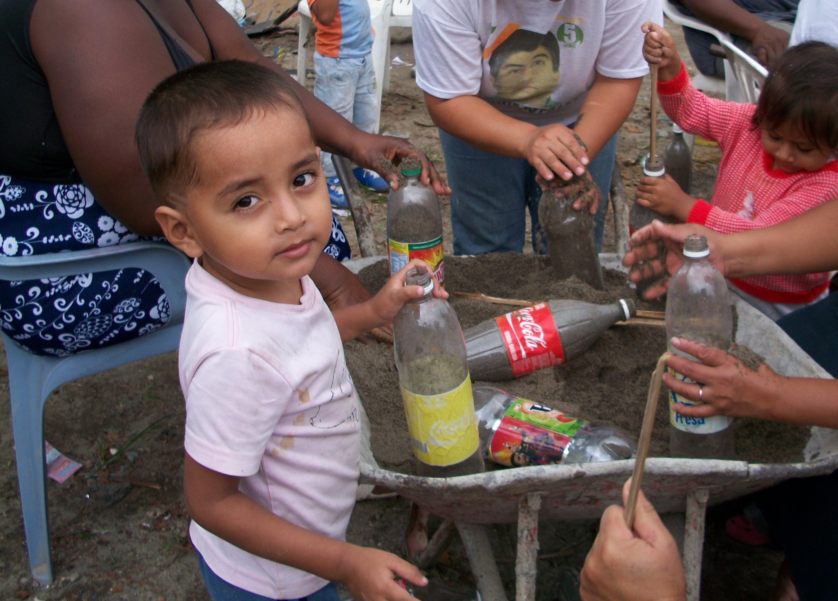Teaching how to make buildings from plastic bottles. From the MAP website.
