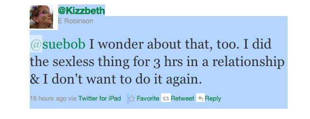 The other night on Twitter I started ranting, after hearing about yet another sexless married couple I’m acquainted with.