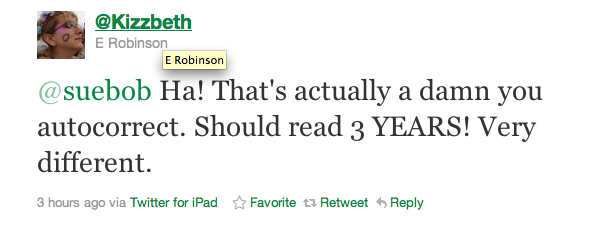 That’s one funny autocorrect! Great to meet you at BlogHer ’11, Suebob. Hope to stay connected on Twitter!
