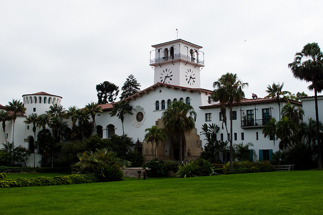 So I went and got there about half an hour late because I had to drive up there after work. I parked a distance away from the Santa Barbara Courthouse (sometimes called the most beautiful civic building in the world, and I tend to agree – see the photo), thinking there would be a huge crowd. Hoping.