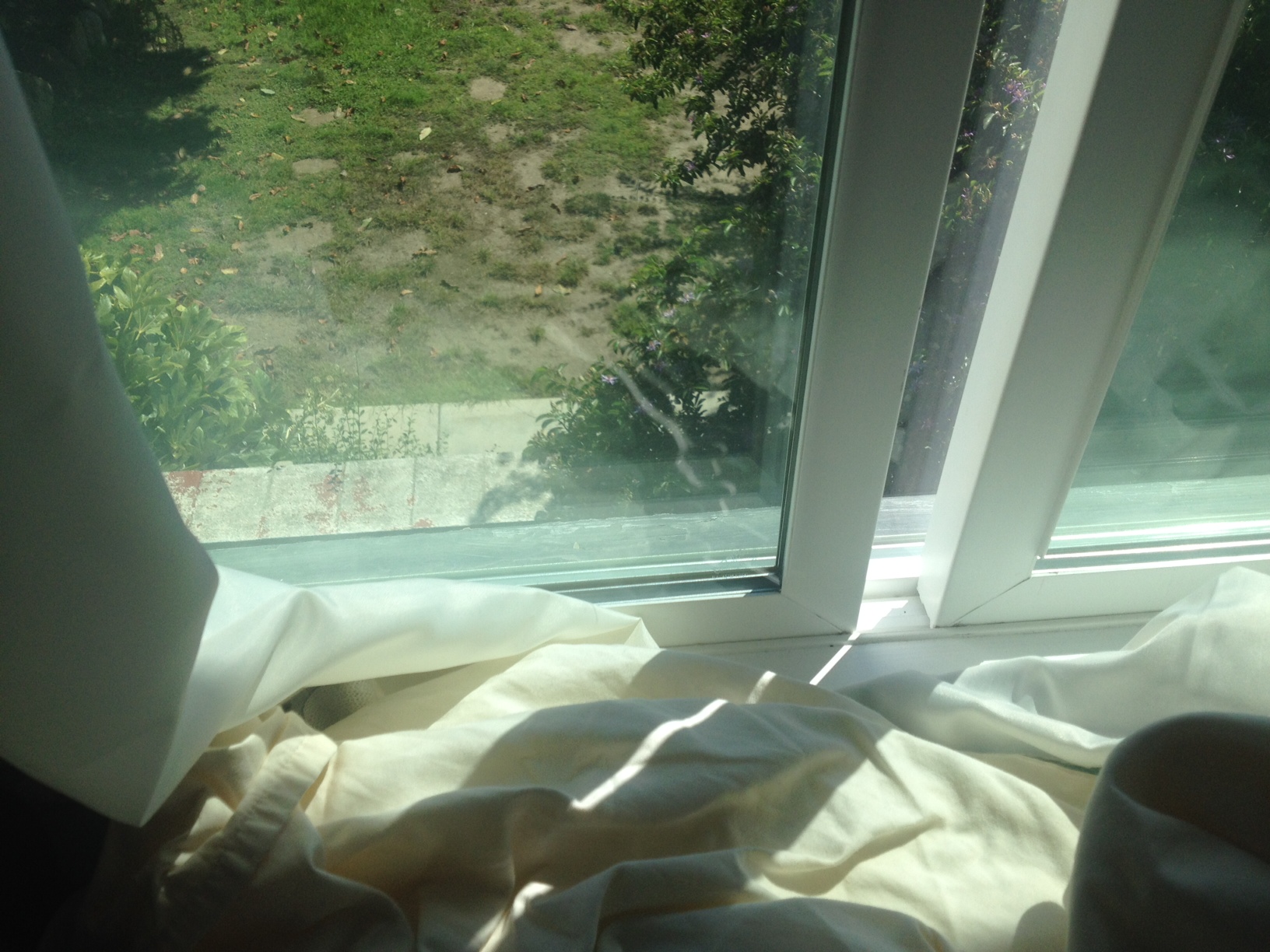 ‘Bout six feet. That’s their back yard from my bed. The bed where Abbie Lynn likes to sleep during the day.
